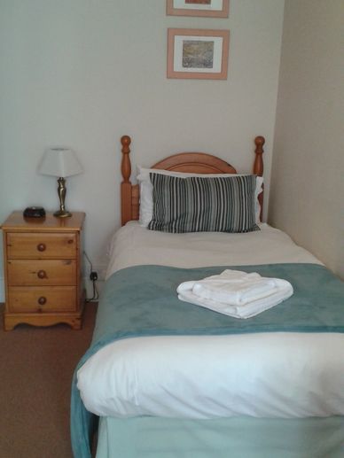 SINGLE ROOM on the ground floor with one single bed. Window overlooking the quiet street at the rear of the B&B. En-suite shower room with walk-in shower, WC and wash basin.