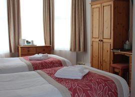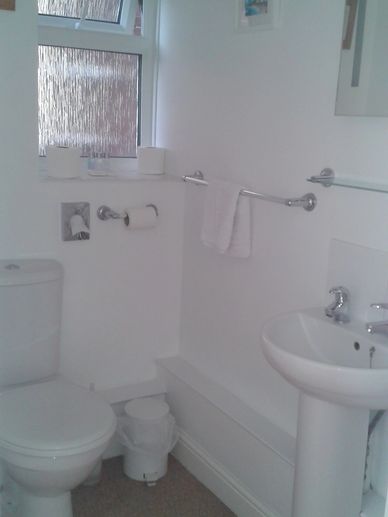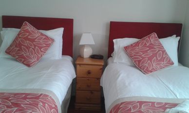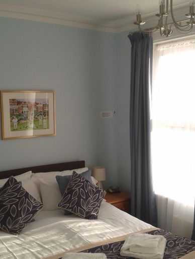 TWIN ROOM on the ground floor with large bay window overlooking the quiet street at the rear of the property. En suite shower room with walk in shower, wc and wash basin. Two single beds. Please be aware that while this room is on the ground floor, there are 5 fairly shallow steps up to the front door of the property.