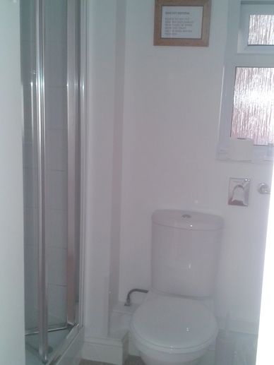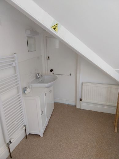 This is a small room in the eaves and has restricted height with sloping ceilings in the bedroom and in the bathroom by the wash basin.
