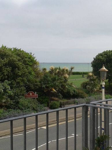 DOUBLE ROOM on the first floor with some sea views and large balcony with patio table and chairs. King size bed. Seating area in bedroom with two easy chairs and a coffee table. En suite shower room with walk-in shower, WC and wash basin. Accessed via one flight of stairs. We are happy to carry luggage upstairs for you.